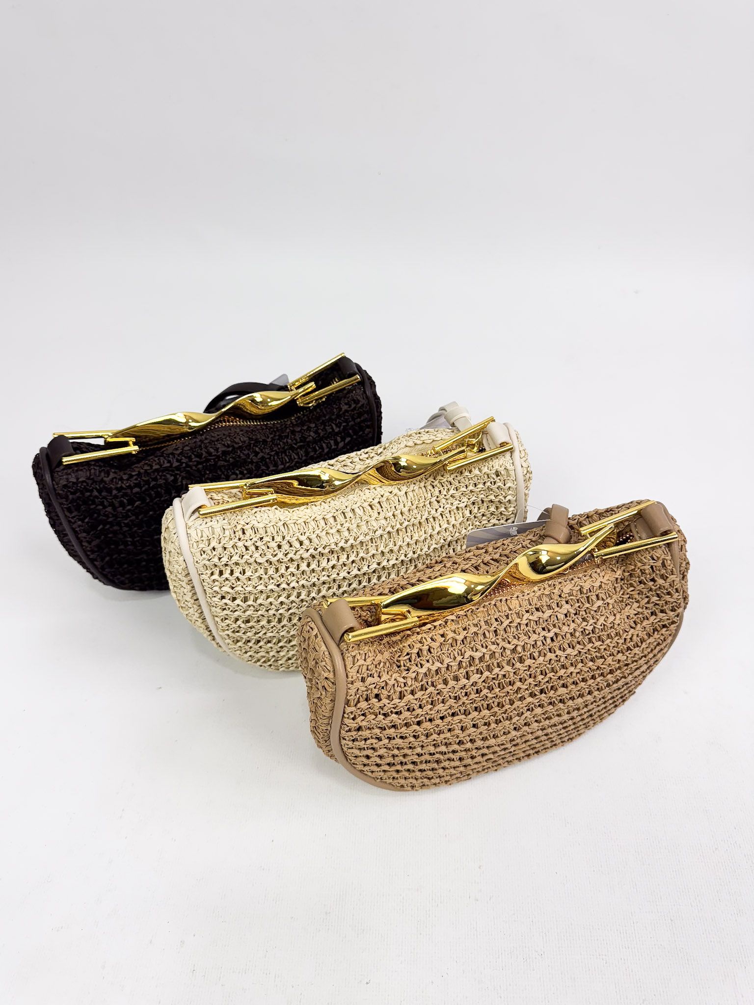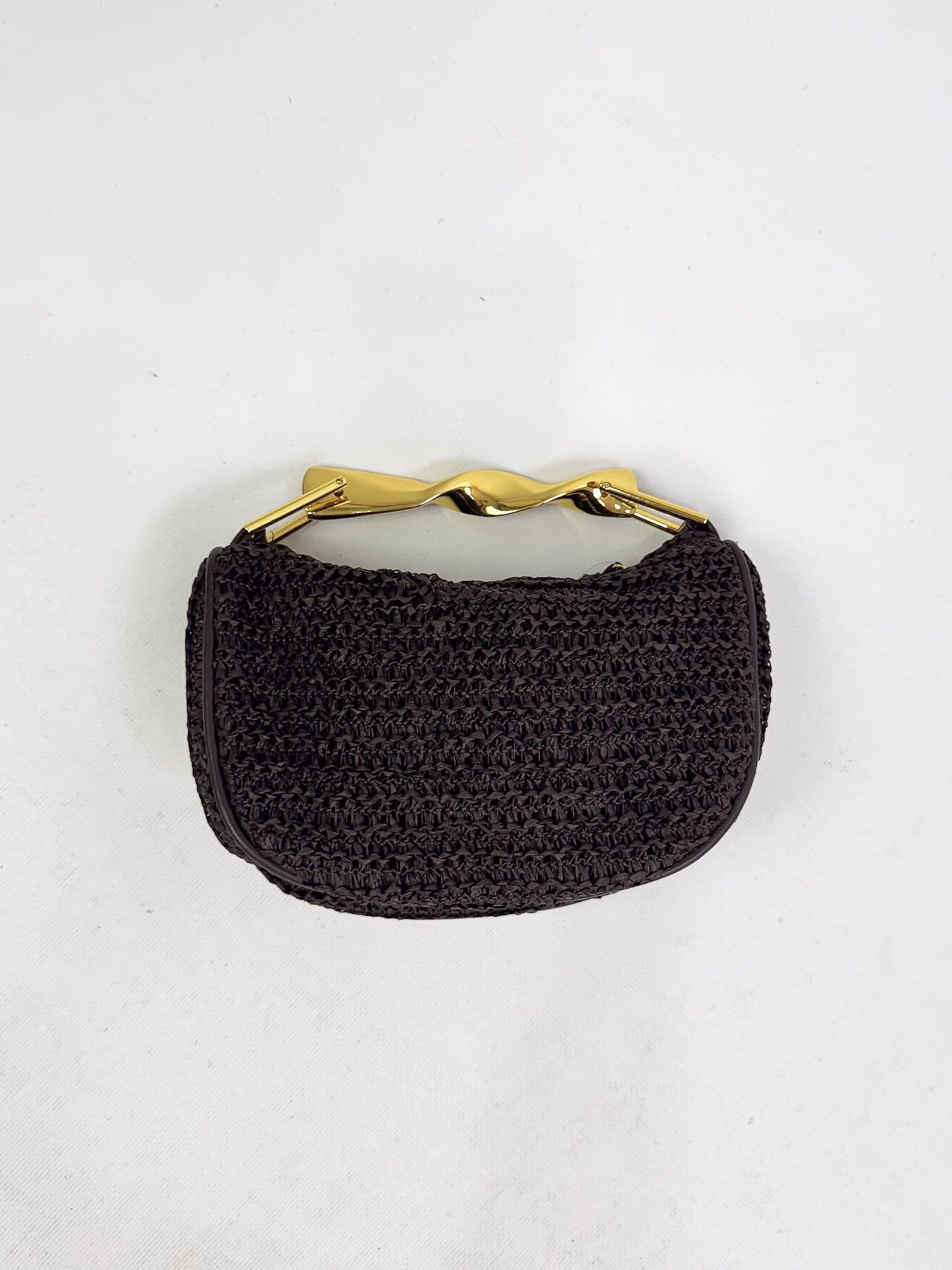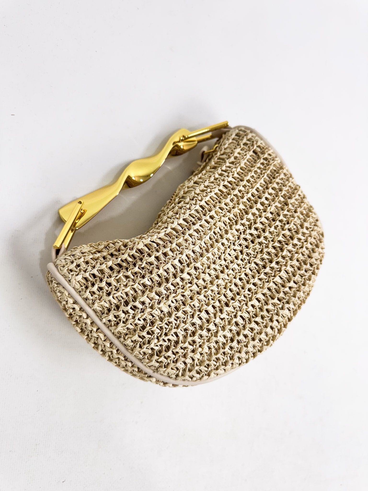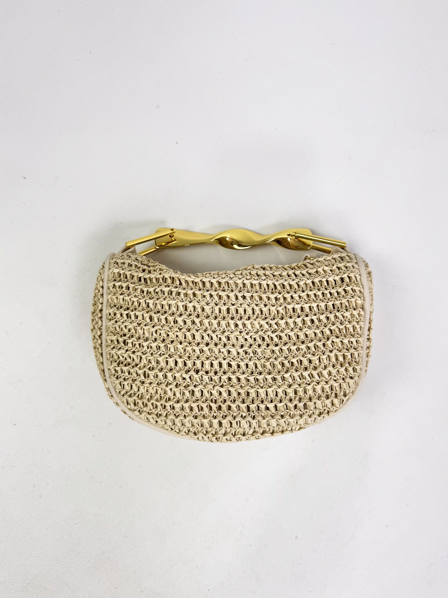 Bolso de tamaño pequeño de rafia con asa fija metálica. Cierre de cremallera. Incluye forro y bolsillo interior. Además, incluye asa bandolera ajustable.