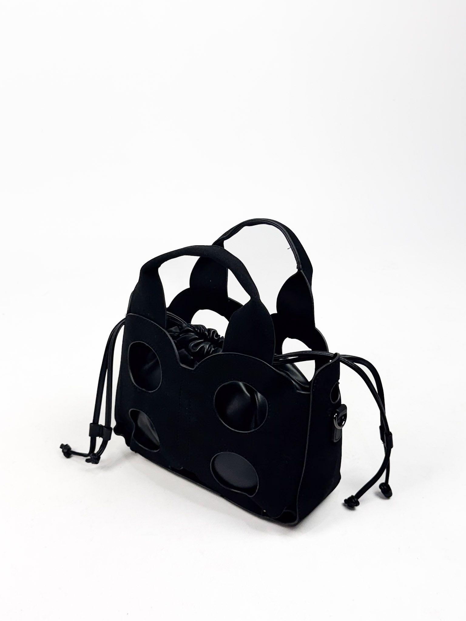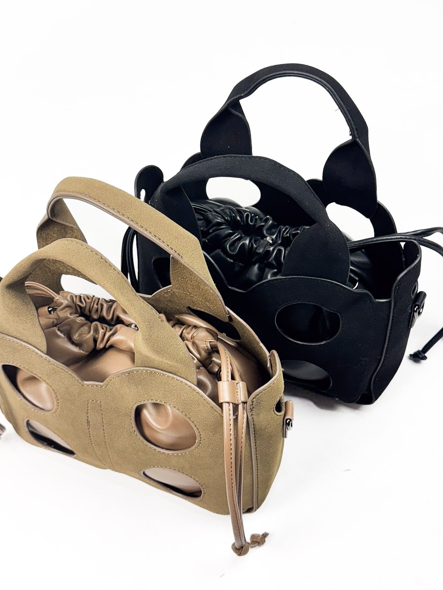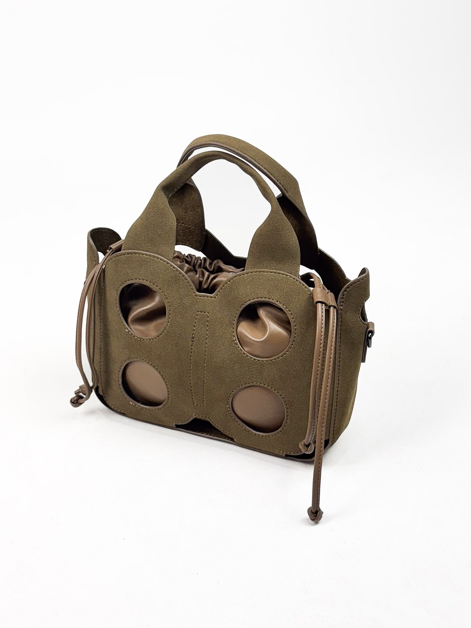 Bolso de mano en ante con detalles calados. Asa fija. Incluye bolso interior tipo saca con forro, además de asa bandolera ajustable.
